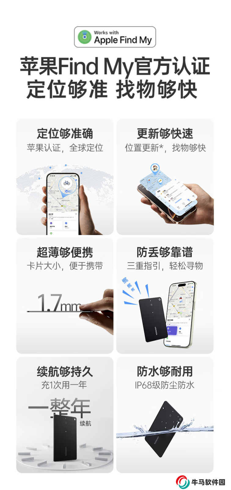該充電器支持蘋果“查找”網(wǎng)絡(luò),在開啟追蹤器電源后即可在蘋果“查找”App中進(jìn)行配對連接,追蹤器同時(shí)支持“反追蹤技術(shù)”,也就是如果其他人的定位器混入到自己的隨身物品時(shí),手機(jī)便會提醒。