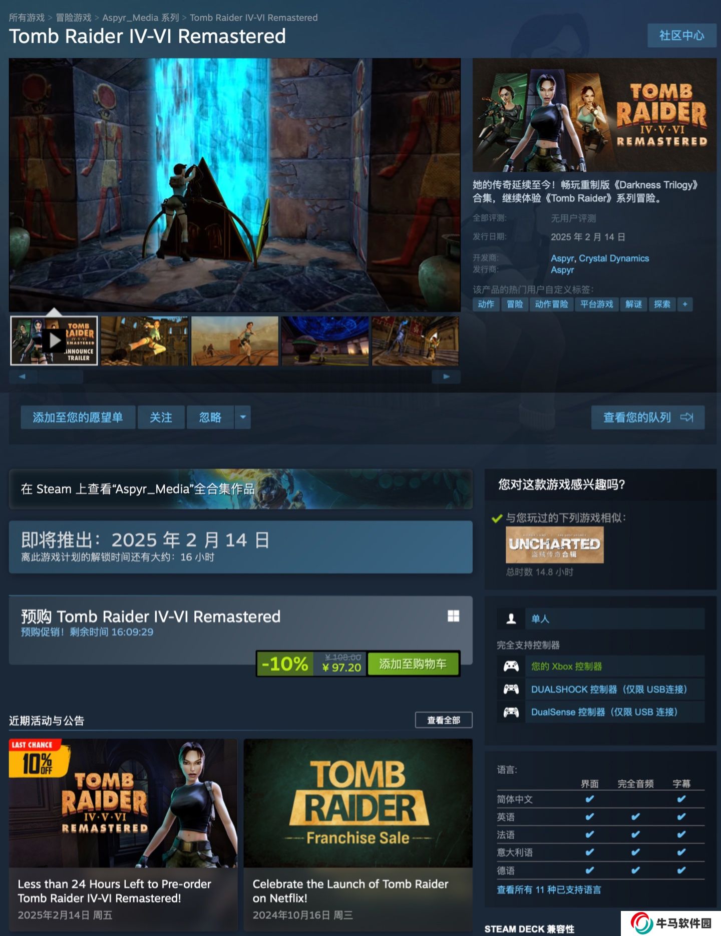 本站 2 月 14 日消息,Crystal Dynamics 宣布《古墓麗影4-6 重置版(Tomb Raider IV-VI Remastered)》將于今天發(fā)售,主要收錄系列游戲三部舊作《古墓麗影:最后的啟示》、《古墓麗影:編年史》,以及《古墓麗影:黑暗天使》。