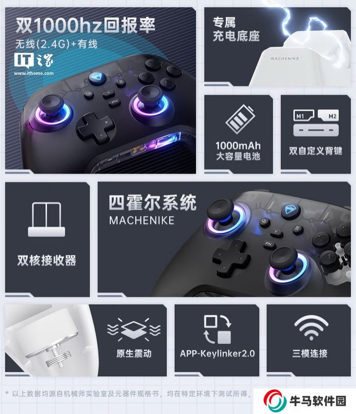 這款手柄采用微軟Xbox手柄布局,整體采用半透明設(shè)計(jì),配備類膚UV漆,采用雙霍爾搖桿及雙霍爾扳機(jī)系統(tǒng),背面配備雙自定義背鍵,手柄支持有線 / 2.4G 下1KHz回報(bào)率,而在藍(lán)牙下為125Hz回報(bào)率。
