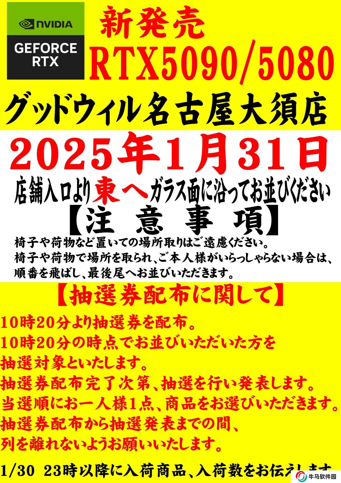 名古屋“大須”商店通過(guò) X 平臺(tái)發(fā)布了關(guān)于抽獎(jiǎng)銷售英偉達(dá) GeForce RTX 5090 或 RTX 5080 顯卡的詳細(xì)信息。根據(jù)通知,銷售將于當(dāng)?shù)貢r(shí)間 1 月 31 日上午 11 時(shí)正式開始。顧客需在上午 10:20 排隊(duì),屆時(shí)將獲得抽獎(jiǎng)券。抽獎(jiǎng)結(jié)束后,中獎(jiǎng)?wù)呖梢园错樞蜻x擇一款顯卡。
