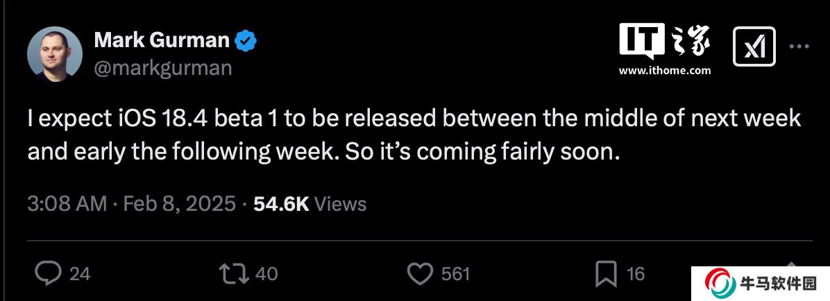 本站 2 月 8 日消息,彭博社的馬克?古爾曼(Mark Gurman)在X平臺發(fā)帖,聲稱蘋果公司最快將在下周推出iOS 18.4的首個測試版。