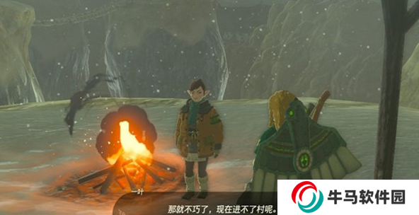 2、不過(guò)想要進(jìn)入利特村的橋梁斷掉了,這里需要利用風(fēng)流飛過(guò)去,在這里會(huì)看到一葉在篝火旁邊,我們丟進(jìn)海拉魯球果進(jìn)篝火堆里。