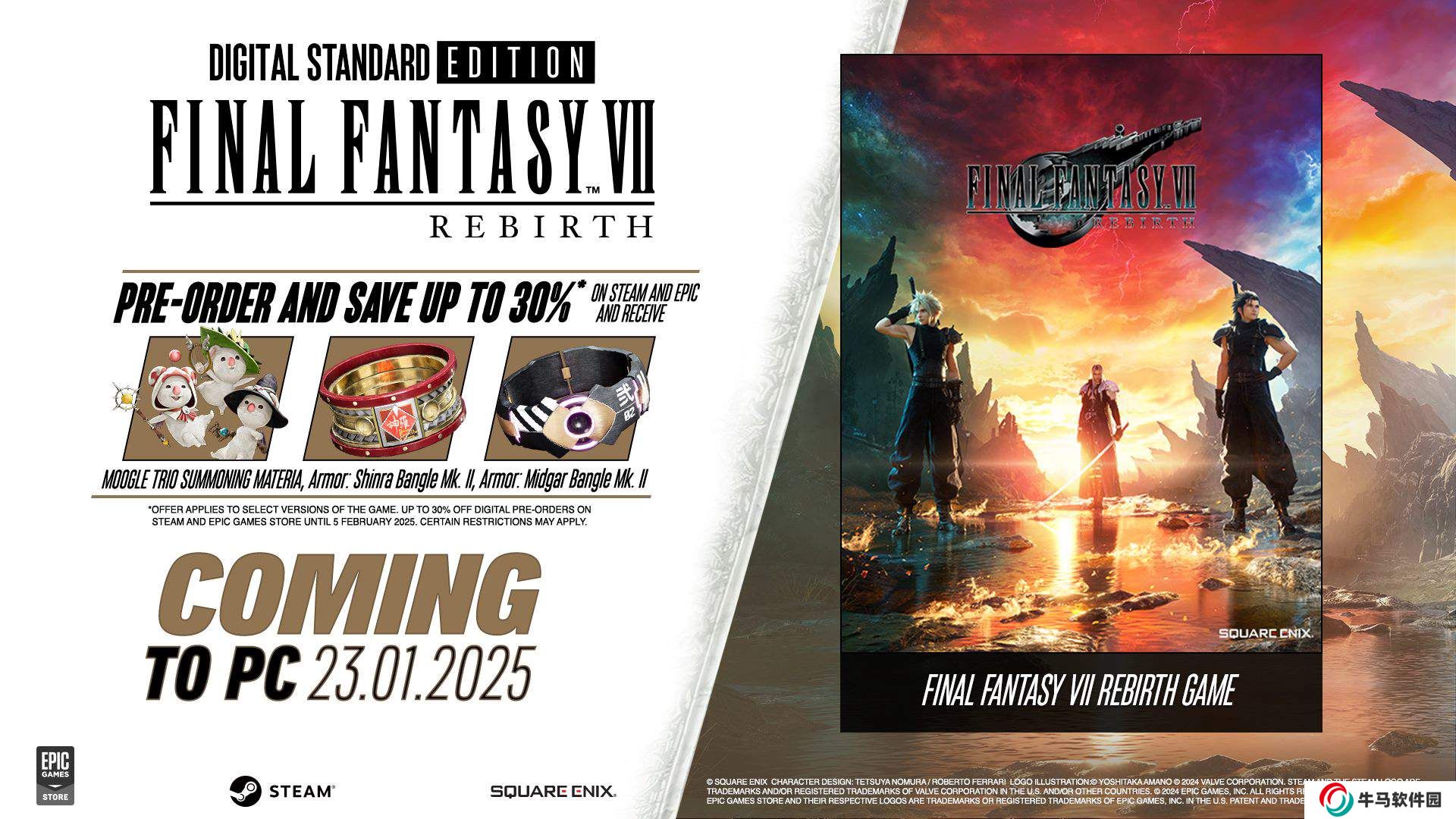 本站 1 月 23 日消息,《最終幻想 7:重生》今日正式上線 PC 平臺,Steam 和 Epic 將于 1 月 23 日晚上 10 點正式解禁,在那之前購買仍可獲得預購特典。