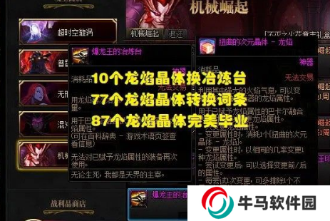 首先需要用10個(gè)龍焰晶體換“爆龍王的冶煉臺(tái)”,冶煉臺(tái)可以為武器賦予第3個(gè)詞條,但此時(shí)詞條屬性并不優(yōu)秀,所以我們還需要用龍焰晶體轉(zhuǎn)換該貼膜詞條,1個(gè)龍焰晶體可轉(zhuǎn)換1次,一把武器最多可轉(zhuǎn)換77次。