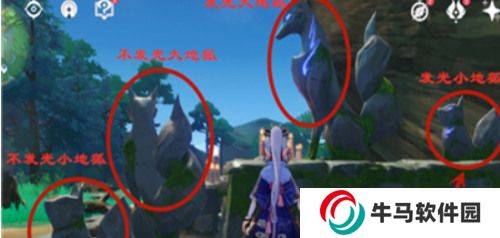 然后在場(chǎng)景中,尋找【發(fā)著藍(lán)光的小地狐雕像】,地狐雕像一共分為四種:發(fā)光/不發(fā)光的大地狐雕像,發(fā)光/不發(fā)光的小地狐雕像,只有發(fā)光的小地狐雕像能用留念鏡照。