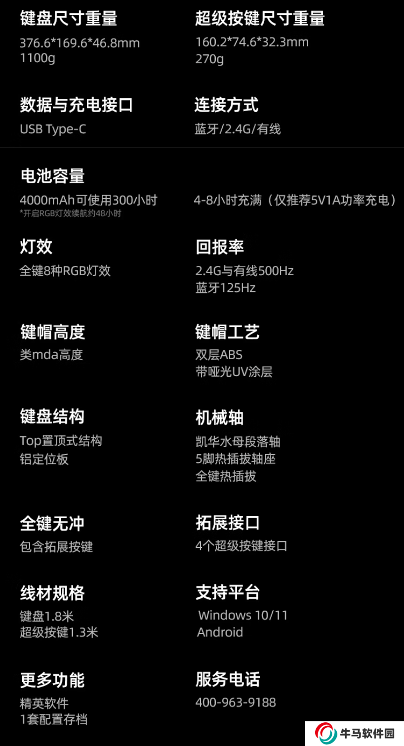 規(guī)格方面,該鍵盤采用87鍵位布局,使用Top結(jié)構(gòu),配備凱華水母段落軸,使用配有半透水晶鍵帽+ UV啞光涂層,鍵帽為類 mda 高度,支持全鍵無沖,鍵盤內(nèi)置 4000 毫安時(shí)電池(續(xù)航至高 300 小時(shí))。