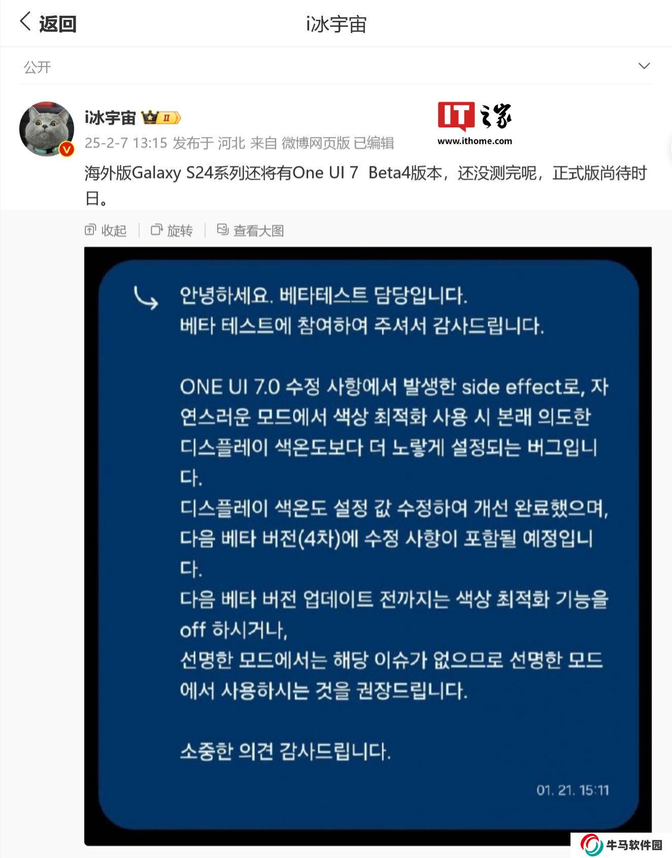 本站 2 月 8 日消息,數(shù)碼博主 @i冰宇宙 昨日(2 月 7 日)發(fā)布微博,稱“海外版 Galaxy S24 系列還將有 One UI 7 Beta 4 版本,還沒測完呢,正式版尚待時(shí)日”。盡管用戶翹首以盼,但由于種種原因,三星延長了 Galaxy S24 系列的測試周期。