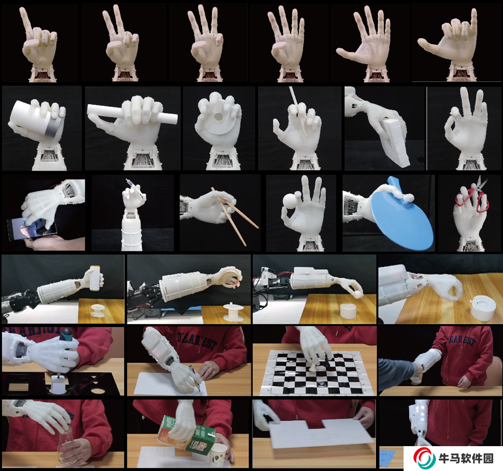 通過與語音識(shí)別技術(shù)結(jié)合,假肢靈巧手具備簡單、友好且低成本的人機(jī)交互能力,支持 60 種語言和 20 種方言,具備 95% 的識(shí)別準(zhǔn)確率和毫秒級(jí)的響應(yīng)時(shí)間,適于在截肢患者中普及。在臨床測試中,一名 60 歲女性截肢患者僅用半天便熟練掌握該假肢靈巧手的使用,成功完成了多項(xiàng)標(biāo)準(zhǔn)假肢手功能評(píng)估實(shí)驗(yàn)中的代表性任務(wù),包括南安普頓手功能評(píng)估程序(SHAP)和沃爾夫運(yùn)動(dòng)功能測試(WMFT)。值得一提的是,該假肢靈巧手還展現(xiàn)了操作剪刀、使用手機(jī)以及完成復(fù)雜的手語手勢的能力,完美復(fù)現(xiàn)傳統(tǒng)的 33 種人手抓握動(dòng)作,還能夠完成 6 種更高難度的新抓握動(dòng)作,使用場景豐富(圖 2)。該假肢靈巧手具有極強(qiáng)的工程應(yīng)用前景,可為人形機(jī)器人靈巧操作及高性能假肢手研究提供有效的解決方案。