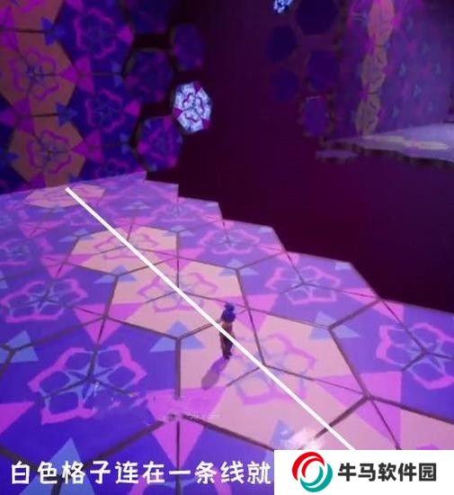 萬(wàn)花筒需要玩家看向兩邊墻壁上有顏色的格子,然后通過(guò)在地板上踩相同顏色的格子進(jìn)行連線(xiàn)就可以謎題了,要注意格子的連線(xiàn)并不是直線(xiàn),可以是曲線(xiàn)。