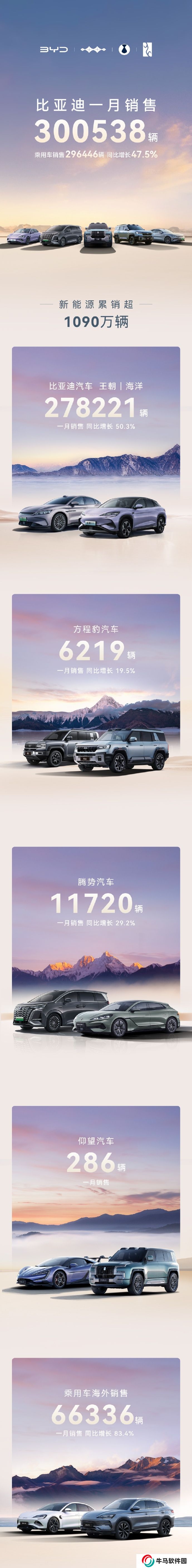 本站 2 月 2 日消息,比亞迪今日公布 1 月銷售新車(chē)300538 輛,乘用車(chē)銷售 296446 輛,同比增長(zhǎng) 47.5%。其中,乘用車(chē)海外銷售 66336 輛,同比增長(zhǎng) 83.4%。此外,比亞迪新能源累銷超 1090 萬(wàn)輛。