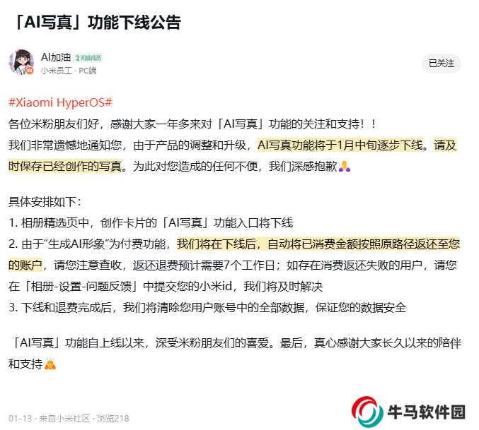 小米官方今日終于確認,小米相冊「AI **」功能將于 2 月 10 日開始逐步下線?!吧?AI 形象”產生的費用,將按照原付費路徑自動返還至您的賬戶。