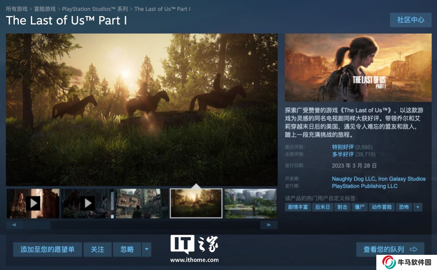 目前,PC 版本《最后生還者:第一章節(jié)(The Last of Us:Part 1)》暫未在 Steam 平臺進(jìn)行打折,游戲原價為 414 元,游戲好評率為 77%“多半好評”,本站附游戲商品頁(點此訪問)。