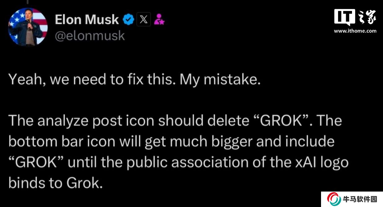 馬斯克在社交媒體上直言,此前 xAI 與 Grok 各自獨立 Logo 的策略是“他的失誤”。他表示,啟用與 xAI 統(tǒng)一風(fēng)格的 Grok 新 Logo 后,“分析帖子”圖標(biāo)中將不再包含“Grok”字樣,而 X 客戶端底部欄中的 Grok 圖標(biāo)將變得更大,并重新加入“Grok”的標(biāo)識文字。馬斯克認(rèn)為這能通過更突出的視覺呈現(xiàn),加速 xAI 標(biāo)志與 Grok 在公共形象上的綁定。