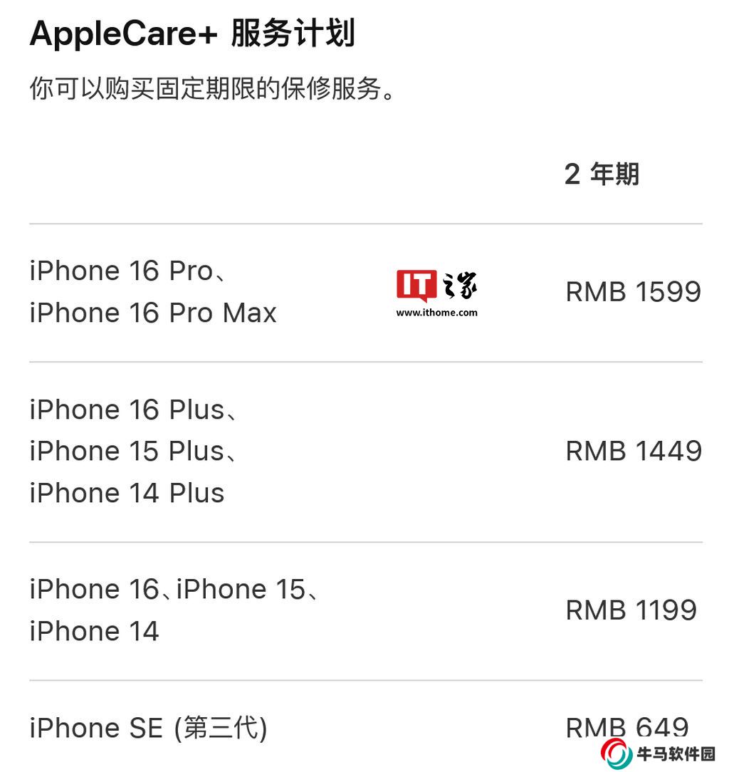 本站查詢蘋果中國官網(wǎng),AppleCare+ 官網(wǎng)頁面并未顯示調(diào)價,適用于 iPhone 的 AppleCare+ 服務計劃 2 年期買斷費用,起售價為 649 元。