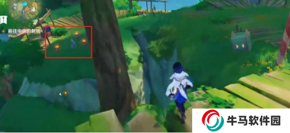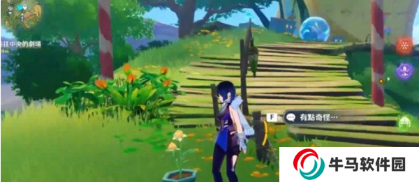 3、第二個(gè)水靈在下面,我們順著木橋下來,在路邊有一朵有花盆的甜甜花,靠近后選擇“有點(diǎn)奇怪”即可找到第二只水靈;