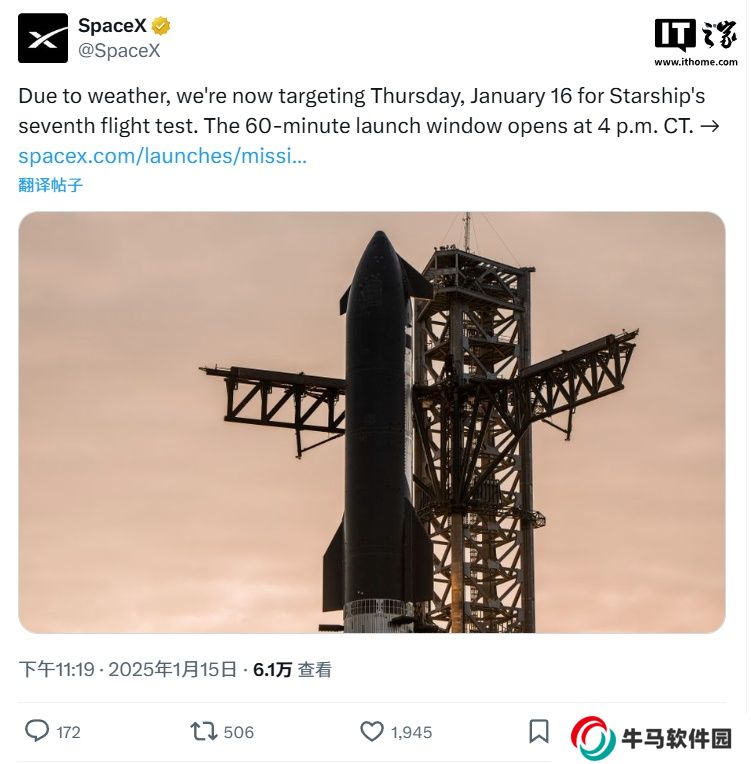 感謝本站網(wǎng)友 yC08 的線索投遞! 本站 1 月 15 日消息,SpaceX 官方 X 賬號今晚宣布:受天氣影響,目前計劃于美國中部時間 1 月 16