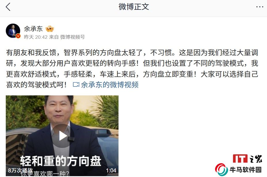 余承東回應智界系列方向盤輕:R7 汽車支持隨速助力轉向,速度越快方向盤越重