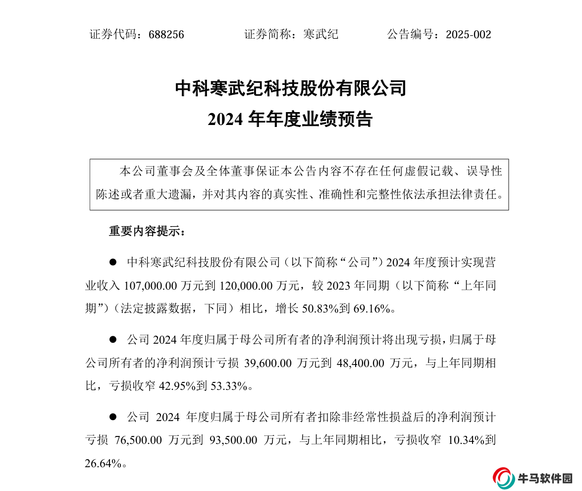 寒武紀(jì):預(yù)計(jì) 2024 年度凈利潤(rùn)虧損 3.96 億~4.84 億元,同比收窄 42.95% 到 53.33%