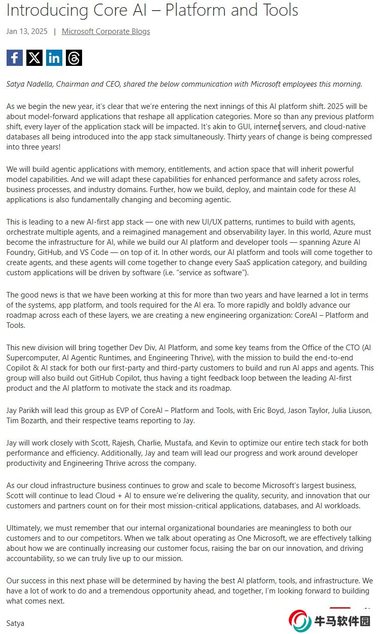 本站 1 月 14 日消息,當地時間周一,微軟 CEO 薩蒂亞?納德拉發(fā)布博客,宣布將組建一個新的 AI 組織 ——CoreAI,專注于開發(fā)端到端的 AI 應用平臺與工具,涵蓋從應用開發(fā)到部署和運行的
