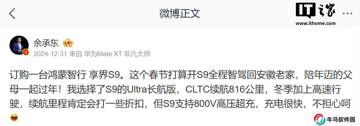 華為余承東曬自購享界 S9:感覺非常棒,百公里電耗 11.4kWh