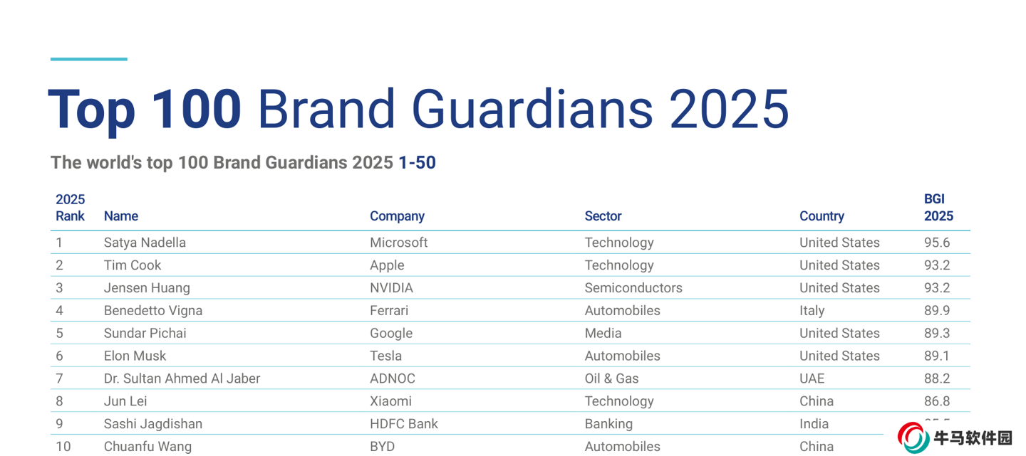 Brand Finance 公布 2025 全球 CEO 百強:納德拉登頂、雷軍第 8、王傳福第 10