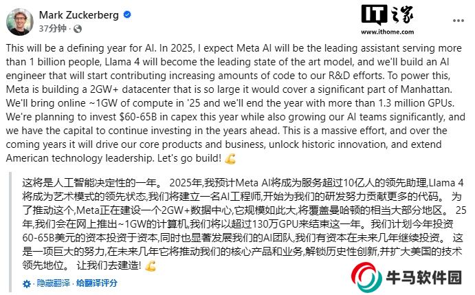 本站 1 月 24 日消息,Meta 首席執(zhí)行官扎克伯格當地時間 1 月 24 日在社交平臺 Facebook 表示,將在 2025 年實現約 1GW 的在線計算,到年底 Meta 將擁有超過 130