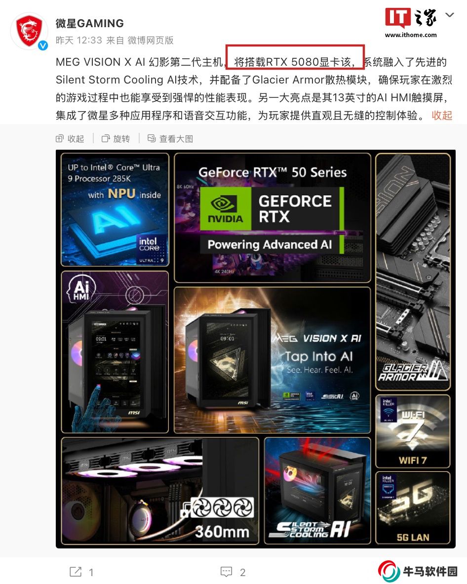 微星 MEG VISION X AI 幻影二代臺(tái)式機(jī)上架:Ultra 9-285K + 48G + RTX5080、機(jī)箱配 1080P 面板,29999 元