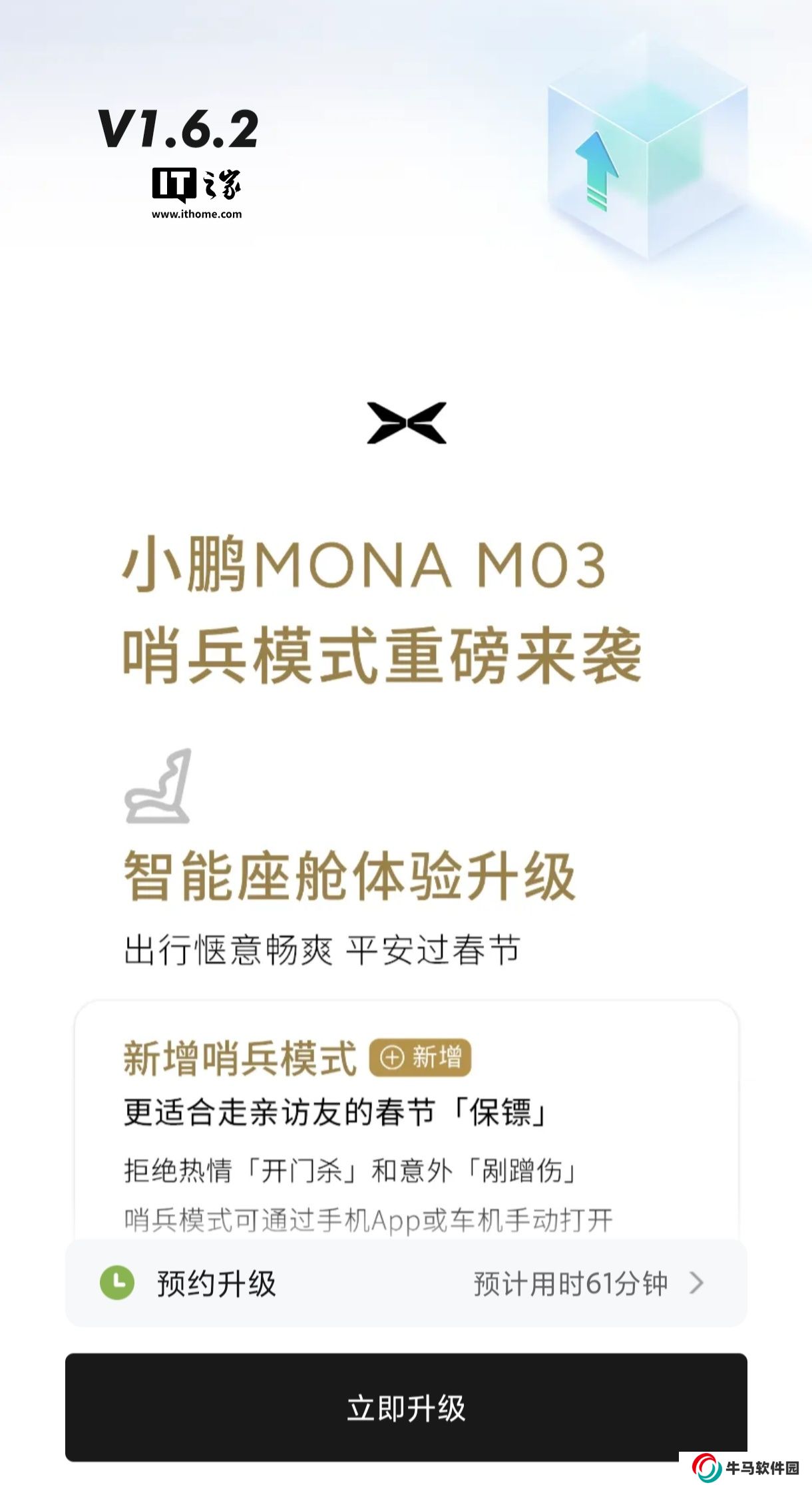 感謝本站網(wǎng)友 蘇曉風 的線索投遞! 本站 1 月 23 日消息,小鵬 MONA M03 汽車現(xiàn)獲 V1 6 2 版本升級,該版本主要新增支持哨兵模式、備用