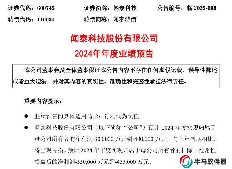 感謝本站網(wǎng)友 HH_KK 的線索投遞! 本站 1 月 19 日消息,聞泰科技昨日發(fā)布公告,預(yù)計 2024 年度實現(xiàn)歸屬于母公司所有者的凈虧損 30億元到