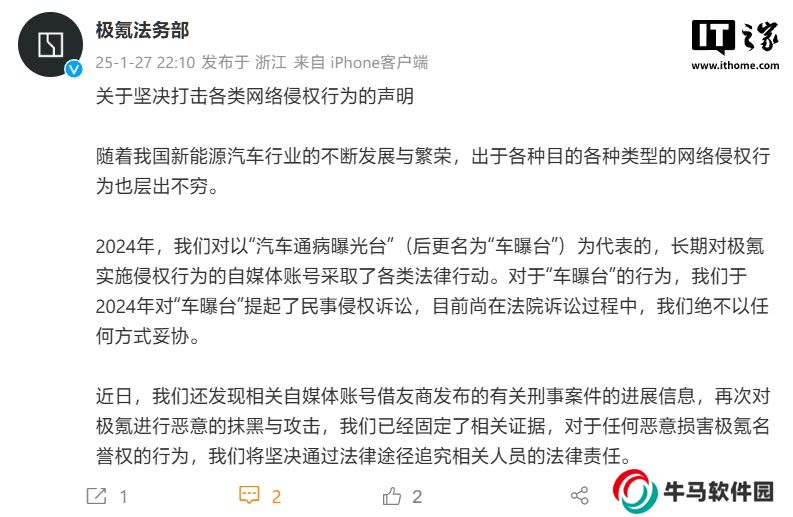 本站 1 月 27 日消息,在上周六晚間發(fā)布了一則聲明之后,極氪法務(wù)部今晚再度發(fā)聲:堅(jiān)決打擊各類網(wǎng)絡(luò)侵權(quán)行為。本站附聲明如下:關(guān)于堅(jiān)決打擊各類網(wǎng)絡(luò)侵權(quán)行為的聲明隨著我國新能源汽車行業(yè)的不斷發(fā)展與繁榮,