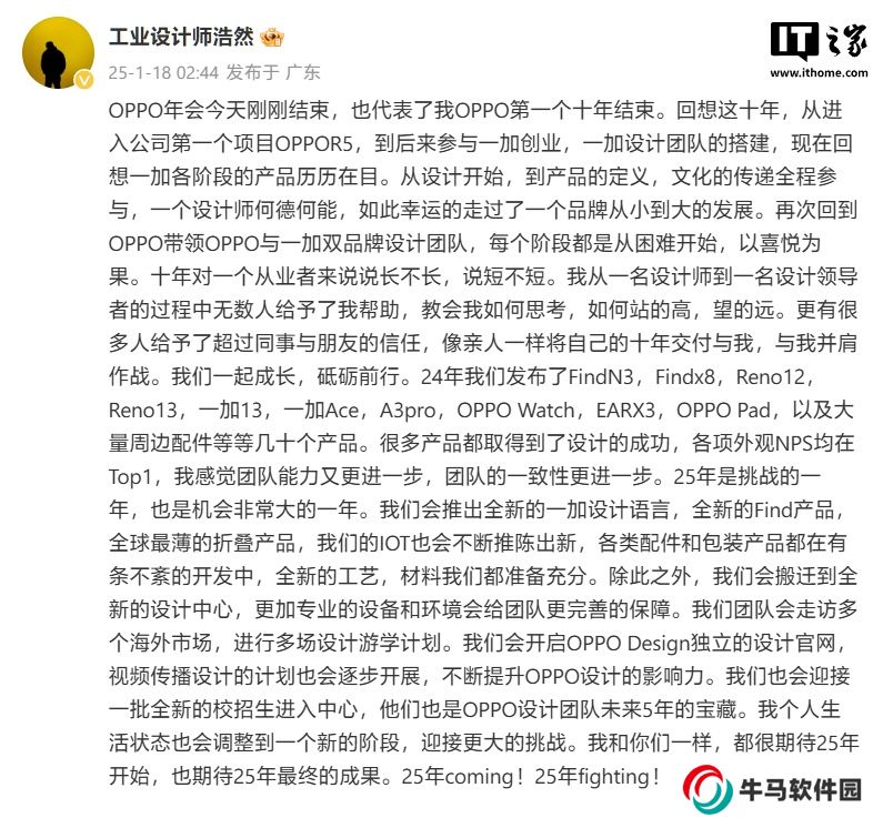 感謝本站網(wǎng)友 軟媒新友1933769 的線索投遞! 本站 1 月 18 日消息,OPPO 工業(yè)設(shè)計(jì)中心總經(jīng)理、一加首席設(shè)計(jì)總監(jiān)劉浩然今日凌晨在微博發(fā)長(zhǎng)文,