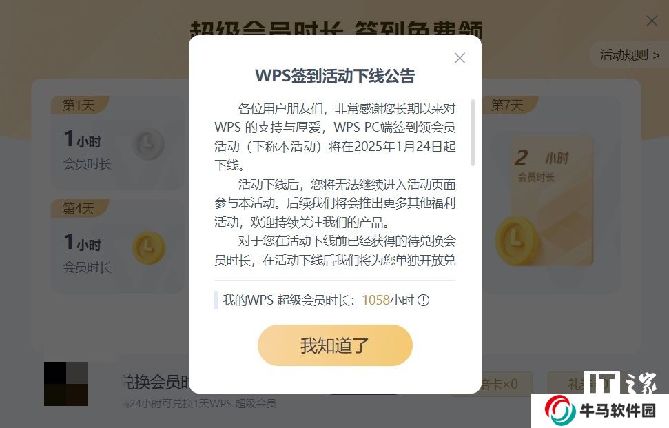 金山 WPS Office 將于 1 月 24 日起下線 PC 端簽到領(lǐng)會員活動