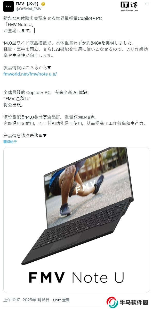 全球最輕 Copilot+ PC“富士通 Note U”發(fā)布:酷睿 Ultra 200V 處理器,848g