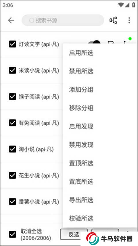 10、返回書源界面,可看到目前書源總共為2006條了,勾選相應(yīng)的書源后選擇右下角【三個(gè)點(diǎn)】圖標(biāo),點(diǎn)擊【啟用所選】即可閱讀喜歡的書籍了,以上就是程序猿小說的用法。