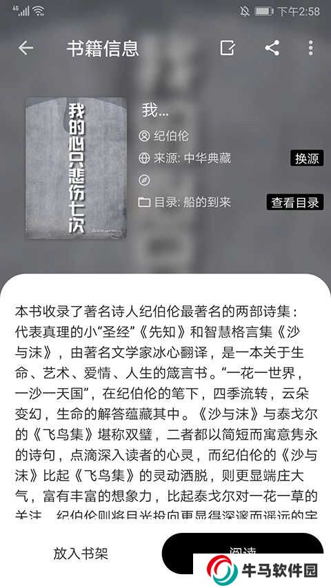 3、進(jìn)入書籍信息界面,可以選擇放入書架和閱讀,選擇放入書架后可看到已經(jīng)在書架欄目中了,方便下次快速打開閱讀,