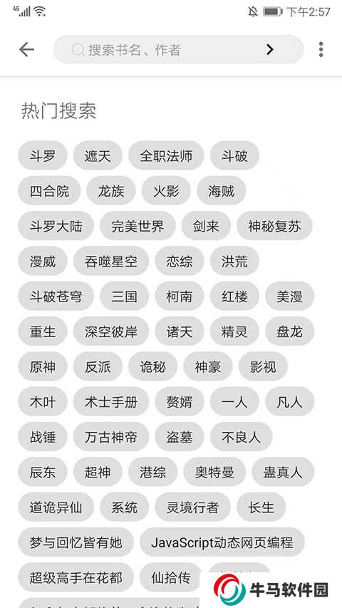 2、進(jìn)入書架欄目,我們可以通過右上角搜索書名或者作者以及選擇下方的熱門搜索來添加喜歡的小說,