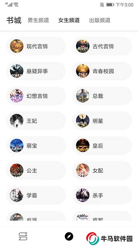 4、進(jìn)入書城欄目,包括男生頻道、女生頻道和出版頻道,其中包括現(xiàn)代言情、青春校園、學(xué)霸、殺手等等各種類型的書籍,用戶可根據(jù)需求選擇閱讀,