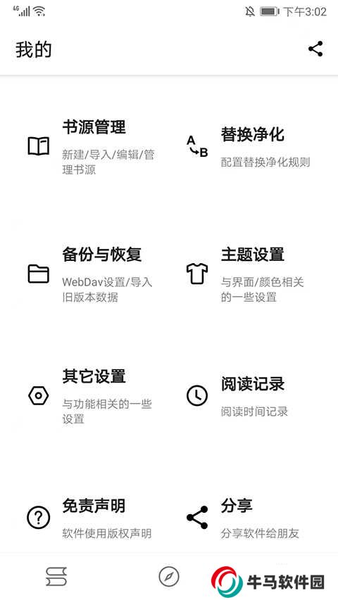 5、進(jìn)入我的欄目,包括書源管理、替換凈化、備份與恢復(fù)、主題設(shè)置、其他設(shè)置、閱讀記錄等分欄,這里以書源管理為例,教大家如何導(dǎo)入書源,