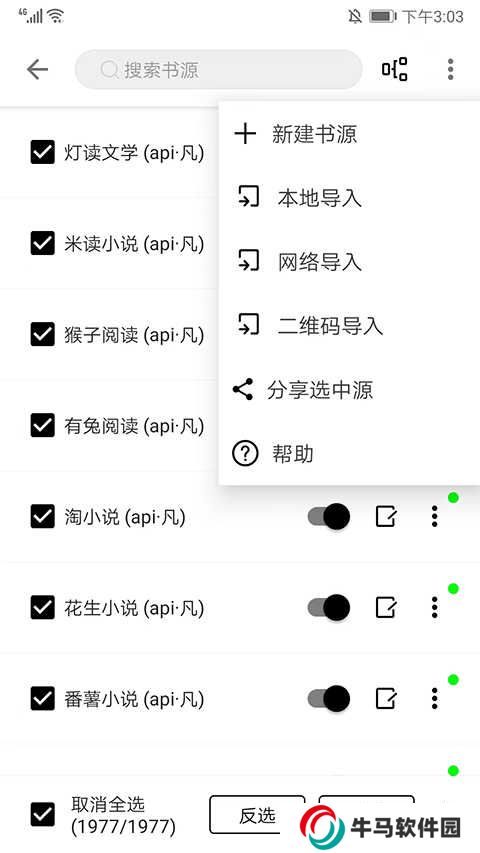6、進(jìn)入書源界面,可看到目前有1977條書源,勾選后即可啟用,我們選擇右上角【三個(gè)點(diǎn)】圖標(biāo),可進(jìn)行導(dǎo)入書源的操作,包括新建書源、本地導(dǎo)入、網(wǎng)絡(luò)導(dǎo)入、二維碼導(dǎo)入等方式,