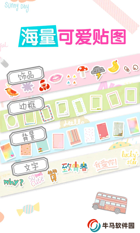 3、全新整理的可愛拼圖風(fēng)格,做到了用“文字 ”萌動心情,隨時分享你的美圖日記。
