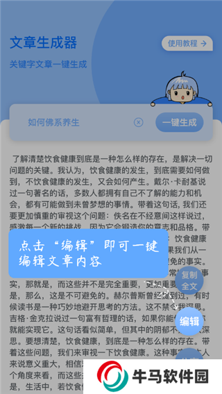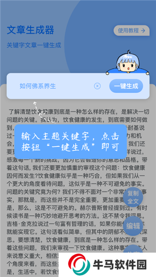 文章生成器app是一款專注于文章生成的制作工具,該生成器的使用方式也是極為簡單,只需要輸入所要生成的主題和要求,就可以直接的為你進(jìn)行生成,所生成的內(nèi)容是完全原創(chuàng)的,絲毫不用擔(dān)心會出現(xiàn)重復(fù)度過高的情況。同時(shí)自己創(chuàng)作一半的作品也可以通過文章生成器進(jìn)行繼續(xù)的生成,生成內(nèi)容和上文的語音極為的流暢,不會有硬湊字的情況。