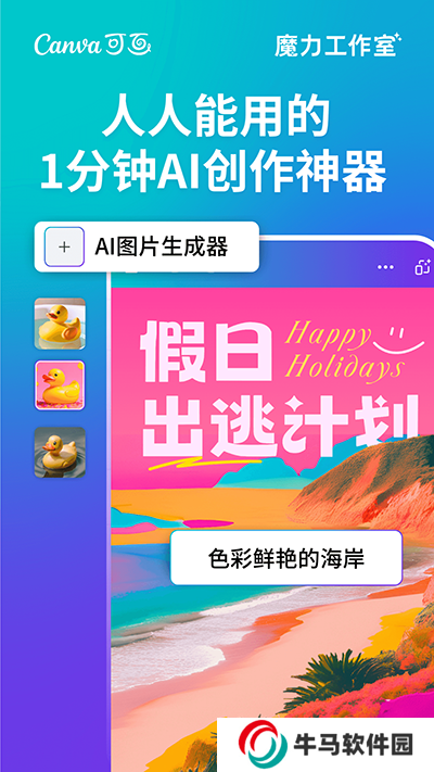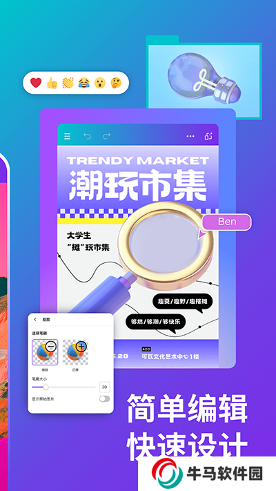 Canva是你手機(jī)上的AI設(shè)計(jì)助手,海報(bào)、傳單、公眾號(hào)封面都可以實(shí)現(xiàn),尋找設(shè)計(jì)模板,更換圖片與文字內(nèi)容,簡單幾步就能設(shè)計(jì)出完美的模板作品,告別傳統(tǒng)需要電腦的繁瑣作圖模式,人人都能成為圖片設(shè)計(jì)師。